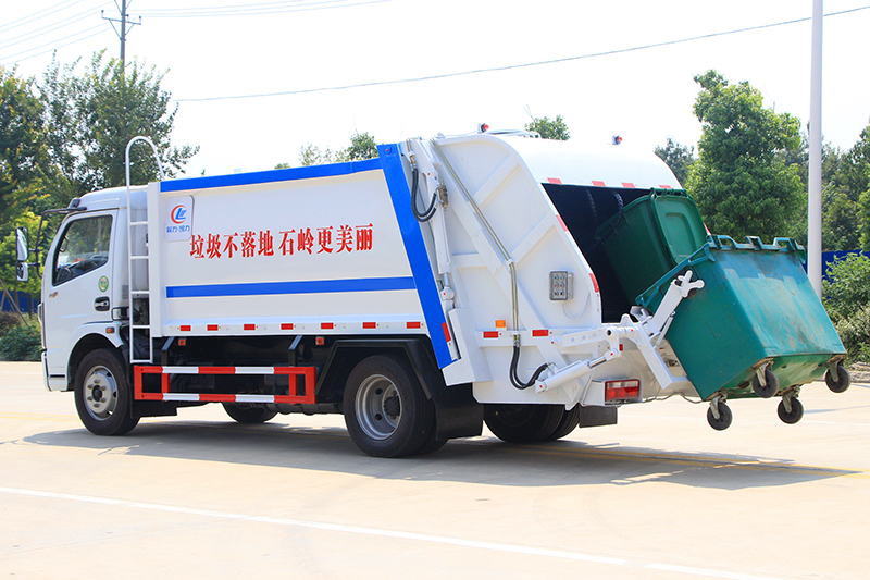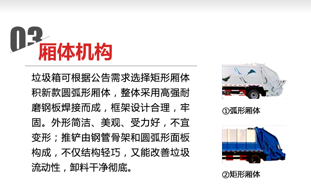 上装配置: 压缩式垃圾车由密封式垃圾厢、液压系统、操作系 统组成。整车为全密封型,自行压缩、自行倾倒、压缩过程中的污水全部进入污水厢。箱体容积8立方,车厢材料4mm武钢优质碳钢板,主要由液压油缸带动副压板工作,进行垃圾反复挤压,有效利用垃圾车车厢空间,大大提高工作效率。