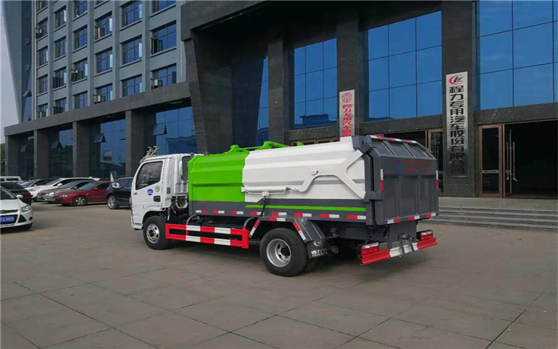 工作原理:自装卸式垃圾车是由密封式垃圾厢、液压系统、操作系统组成,能配几十个垃圾桶,实现一车与多个垃圾桶联合作业,厢体上的液压升降装置可将垃圾桶吊上、放下,上下升降,上下一次工作循环时间为50S,密封式厢体环保卫生,可避免二次污染。其自装式的挂桶装置可直接将路边的垃圾桶挂在上面用提升机直接到在垃圾箱体里面省去了装垃圾的麻烦。